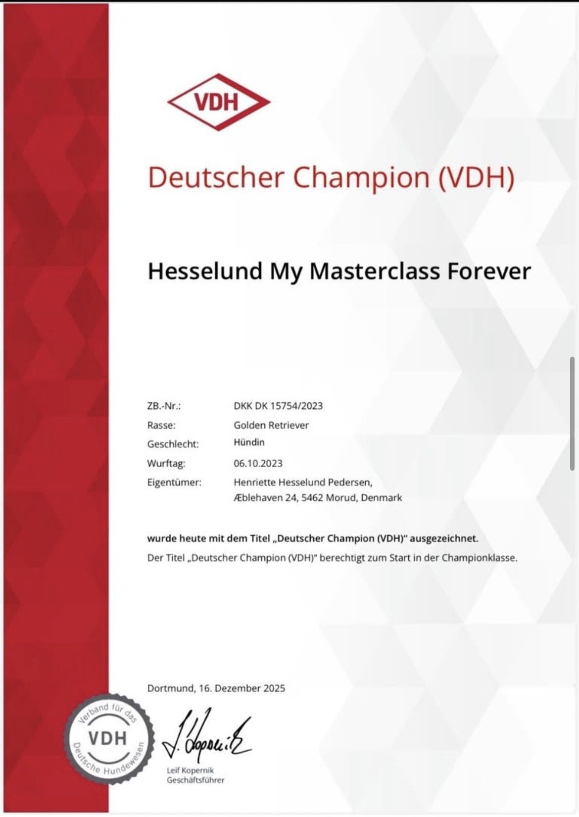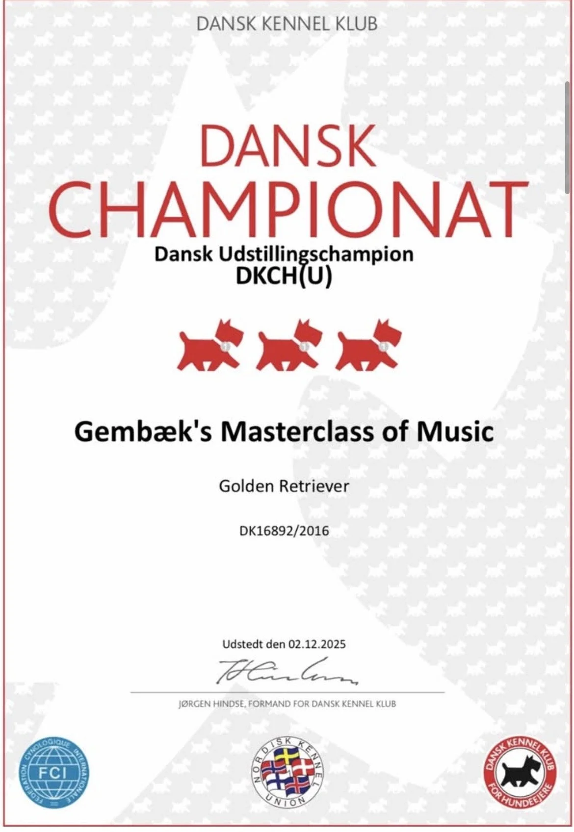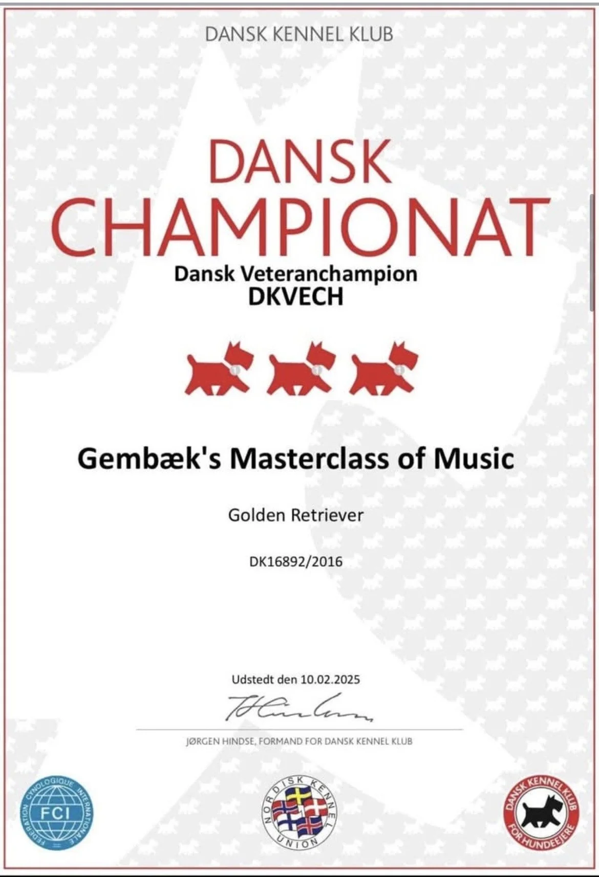 Wilson har opnået titlen Dansk Veteran Champion! Det blev fejret ved Dansk Kennel Klub udstillingen i Fredericia den 8. februar 2025.